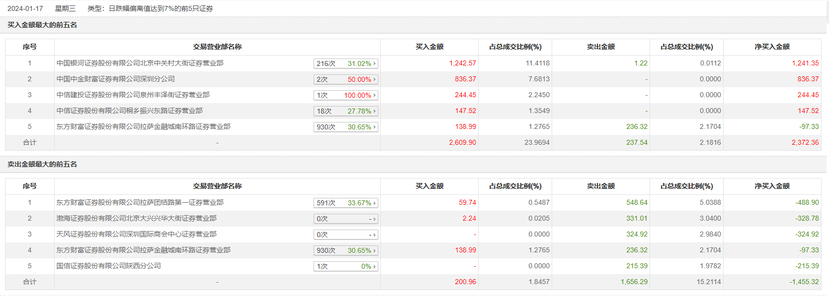 1月17日,金龙羽今日跌停,全天换手率达2.17%,振幅达0%。龙虎榜数据显示,营业部席位合计净买入1014.37万元。其中,东方财富证券拉萨团结路第一证券营业部、渤海证券北京大兴兴华大街证券营业部分别卖出548.64万元、331.01万元;中国银河证券北京中关村大街证券营业部、中国中金财富证券有限公司深圳分公司分别买入1242.57万元、836.37万元。