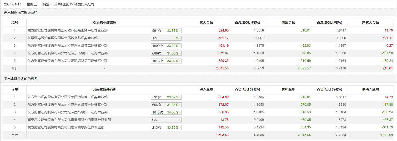 1月17日,*ST左江今日涨停,全天换手率达13.91%,振幅达18.25%。龙虎榜数据显示,营业部席位合计净卖出550.65万元。其中,东方财富证券拉萨团结路第一证券营业部、东吴证券杭州环城北路证券营业部分别买入624.80万元、561.17万元;东方财富证券拉萨团结路第一证券营业部、东方财富证券拉萨东环路第一证券营业部分别卖出610.01万元、570.05万元。