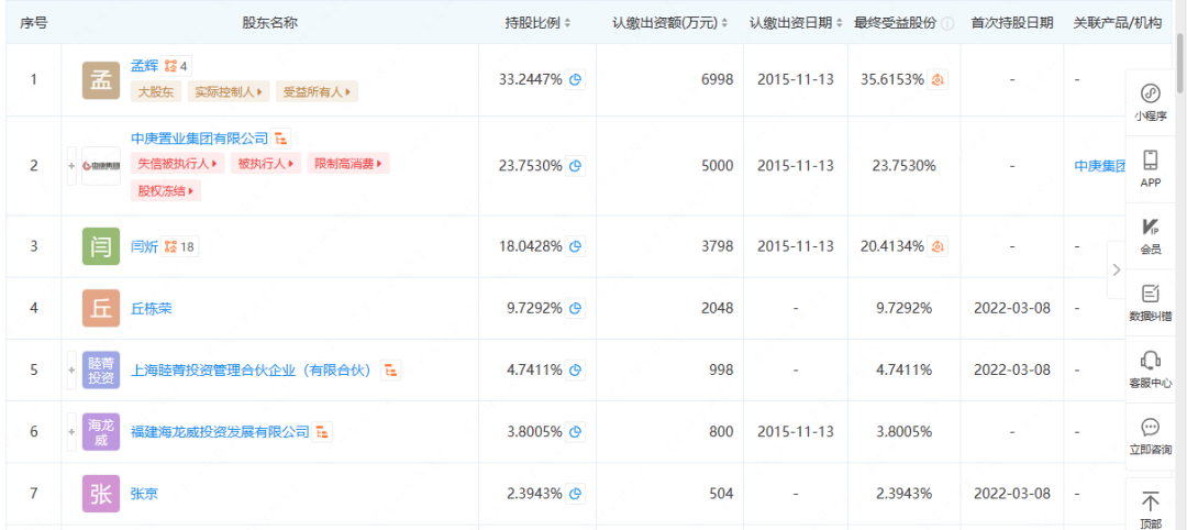不过,随着公司的逐步发展,自然人持股比例在逐步上升,法人股东开始退场。2022年3月,5位中庚基金的高管和员工以个人或机构的名义拍下大连汇盛投资持有的25%股份,其中丘栋荣出资 998万元认购了4.99%的股权,新晋中庚第5大股东。2023年8月,企查查数据显示,被冻结股权的大连海博教育发展退出股东行列,闫炘、孟辉接手,两人持股比例分别上升至18.99%、34.99%。