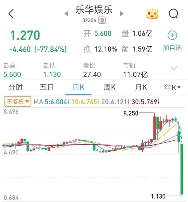 1月16日,乐华娱乐开盘股价便不断走低,一小时内跌幅已达64.92%。截至当日收盘,公司股价下跌77.84%至1.27港元/股,创上市以来新低,截止当日收盘乐华娱乐市值跌至11.07亿港元,对比前一交易日,一天内蒸发近39亿港元,约合36亿元人民币。