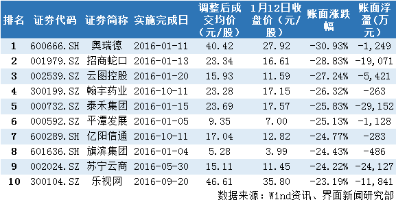 界面新闻进一步统计发现,在上述230份员工持股计划中,占比超过34%的员工持股计划平均成交价已经跌破所对应上市公司1月12日的收盘价。具体而言(考虑到部分上市公司2016年度股价存在除息除权的因素,界面新闻对平均成交价进行复权调整),80家上市公司2016年的员工持股计划目前已出现浮亏。其中,1家公司跌幅超过30%,13家公司跌幅区间为20%-30%。此外,4家上市公司的员工持股计划账面浮亏金额超过1亿元。