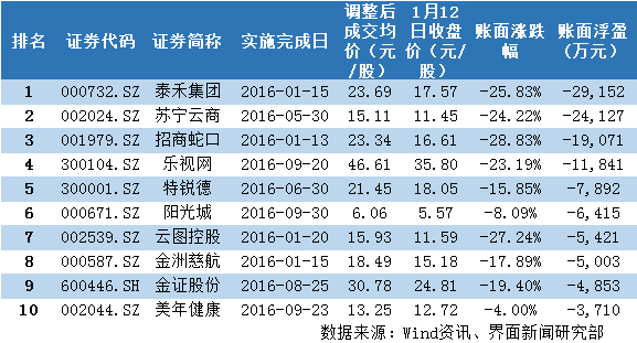 苏宁云商的10亿元规模员工持股计划目前已经浮亏超2亿元。截至1月12日,苏宁云商员工持股计划的账面跌幅也有24.22%。