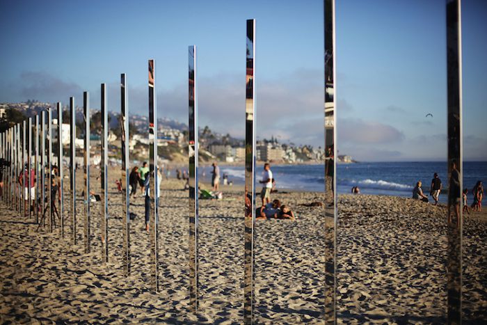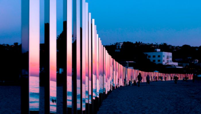 艺术家菲利普·史密斯的作品《1/4英里弧线》坐落于加利福尼亚州的拉古纳海滩,这段长达1/4英里的艺术品在沙滩周围抹上了一缕金色。250根打磨得像镜面一般的不锈钢铁柱均匀从分布在海滩的弧线上,在长达4天的时间内,好奇的沙滩游人们和艺术爱好者们发现了阳光沙滩和冲浪活动如何让这些柱子熠熠生辉。