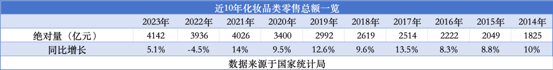 再把时间维度拉至近10年,2023年同比增幅仅超过2022年同期水平,远比不上2014—2021年间化妆品零售总额增速。