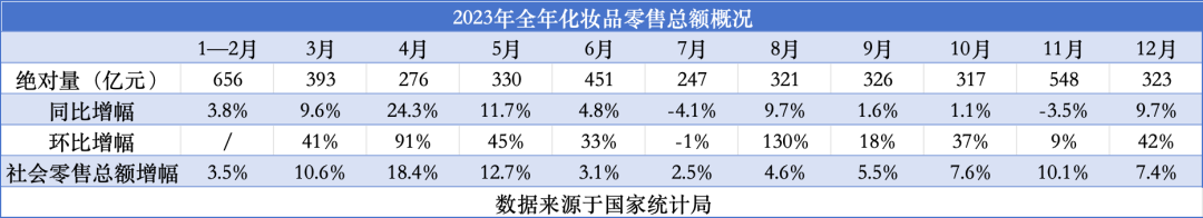 根据统计局发布的数据,2023年全年,化妆品类零售总额录得4142亿元。复盘全年月度表现,去年化妆品类零售额呈现以下3大特征: