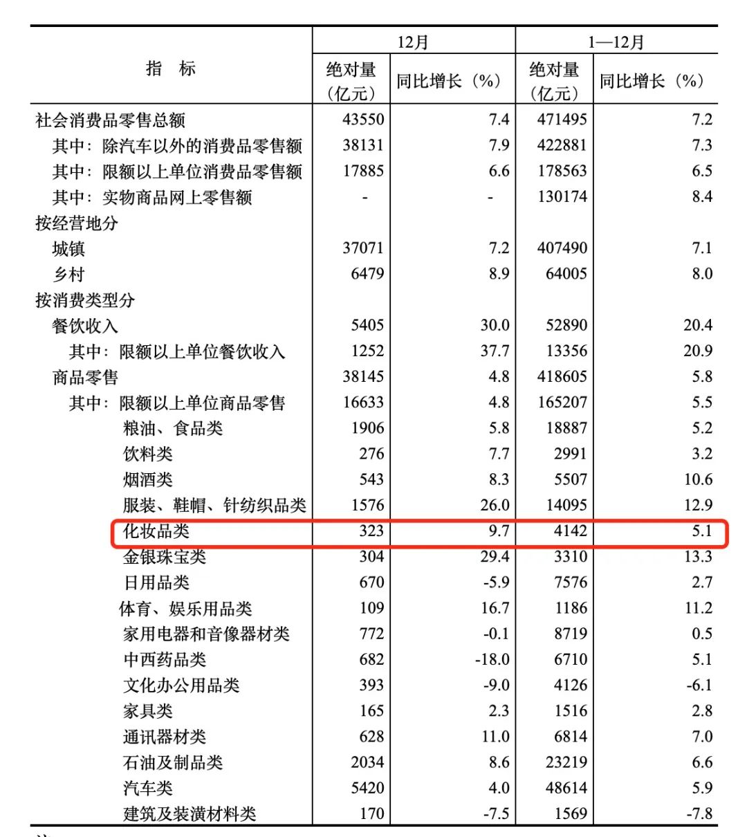1月17日,国家统计局发布数据显示,2023年12月,社会消费品零售总额达43550亿元,同比增长7.4%;其中,限额以上化妆品类零售总额为323亿元,较上月实现了9.7%的增长。