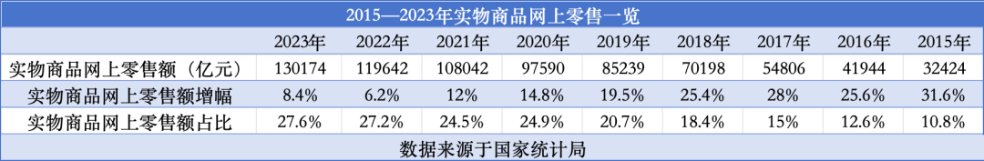 此外,仪美尚还统计了2015—2023年近9年间实物商品网上零售数据,可以看出,去年,实物商品网上零售额8.4%的增幅,仅略高于2022年6.2%的增幅,而远低于2015—2021年的增长速度,尤其是与增速最快的2017年相比,2023年较之低了近20个百分点。