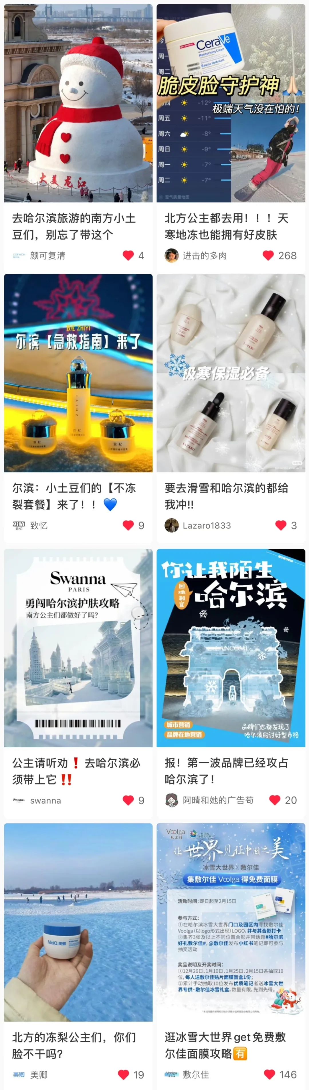 哈尔滨与花式营销更搭哈尔滨曾是东北亚商业枢纽,一个国际化大都市。在哈尔滨旅游的热度下,如今全国各地的冬季时尚汇集于此,不少化妆品品牌也展开了花式营销。这些国内发达地区的最新式最洋气的宣传,与这个冰雪世界相得益彰,并行不悖。小红书上,各大品牌正抓紧“蹭”哈尔滨的热度。有的从干皮的滋润保湿入手,推出“勇闯哈尔滨护肤攻略”,有的从防冻裂切入,向南方网友科普冻伤护理知识,也有面膜品牌以“冻后修复”为卖点,刷了一波存在感。