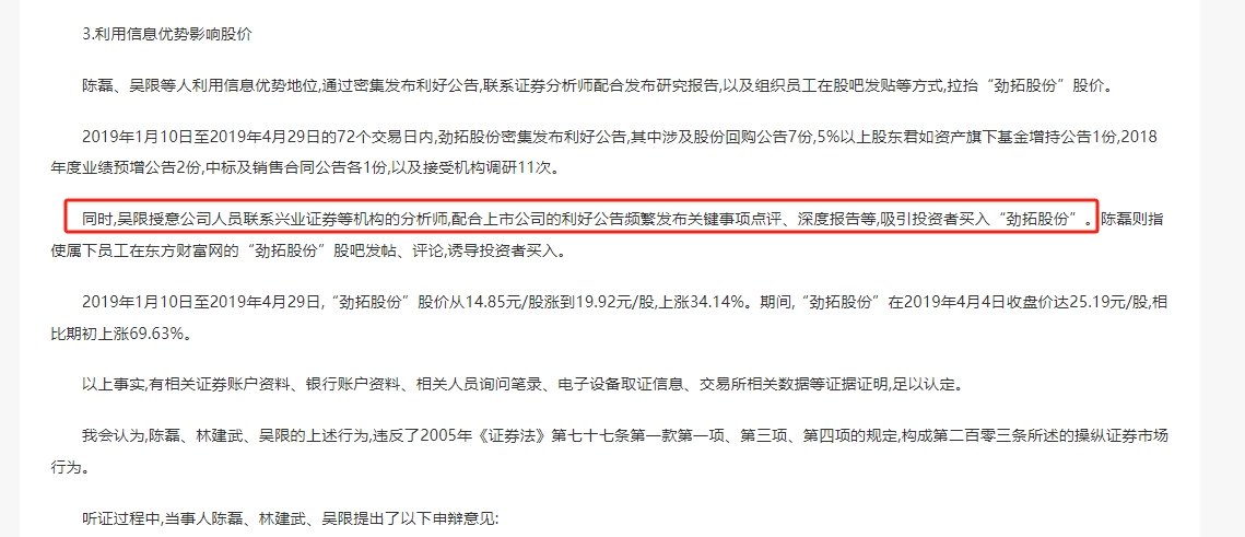 需要一提的是,此次处罚中点名提及兴业证券。处罚决定书显示:“吴限授意公司人员联系兴业证券等机构的分析师,配合上市公司的利好公告频繁发布关键事项点评、深度报告等,吸引投资者买入“劲拓股份”。