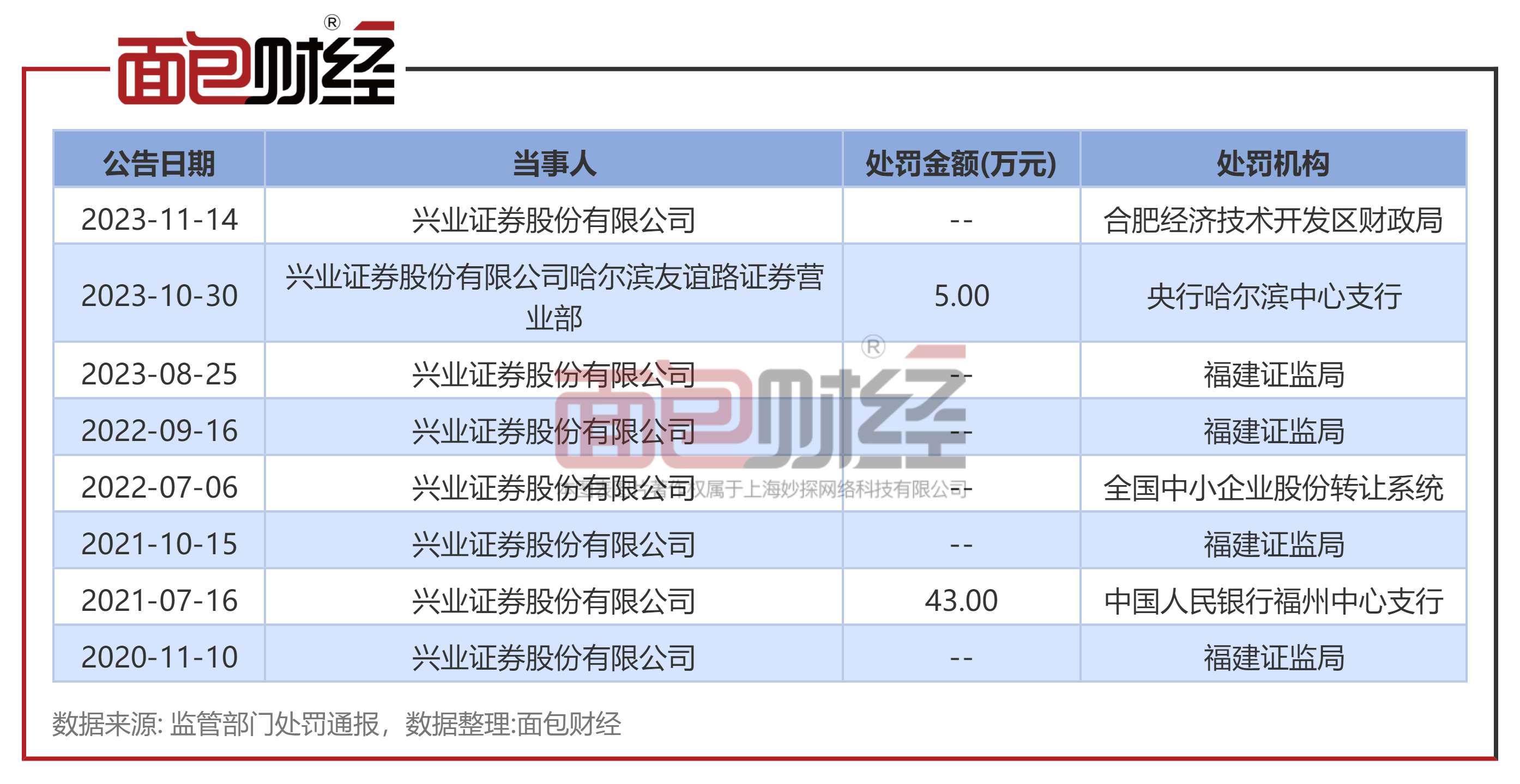 据不完全统计,兴业证券近年来多次被监管处罚,其中部分罚单涉及研究报告违规问题。