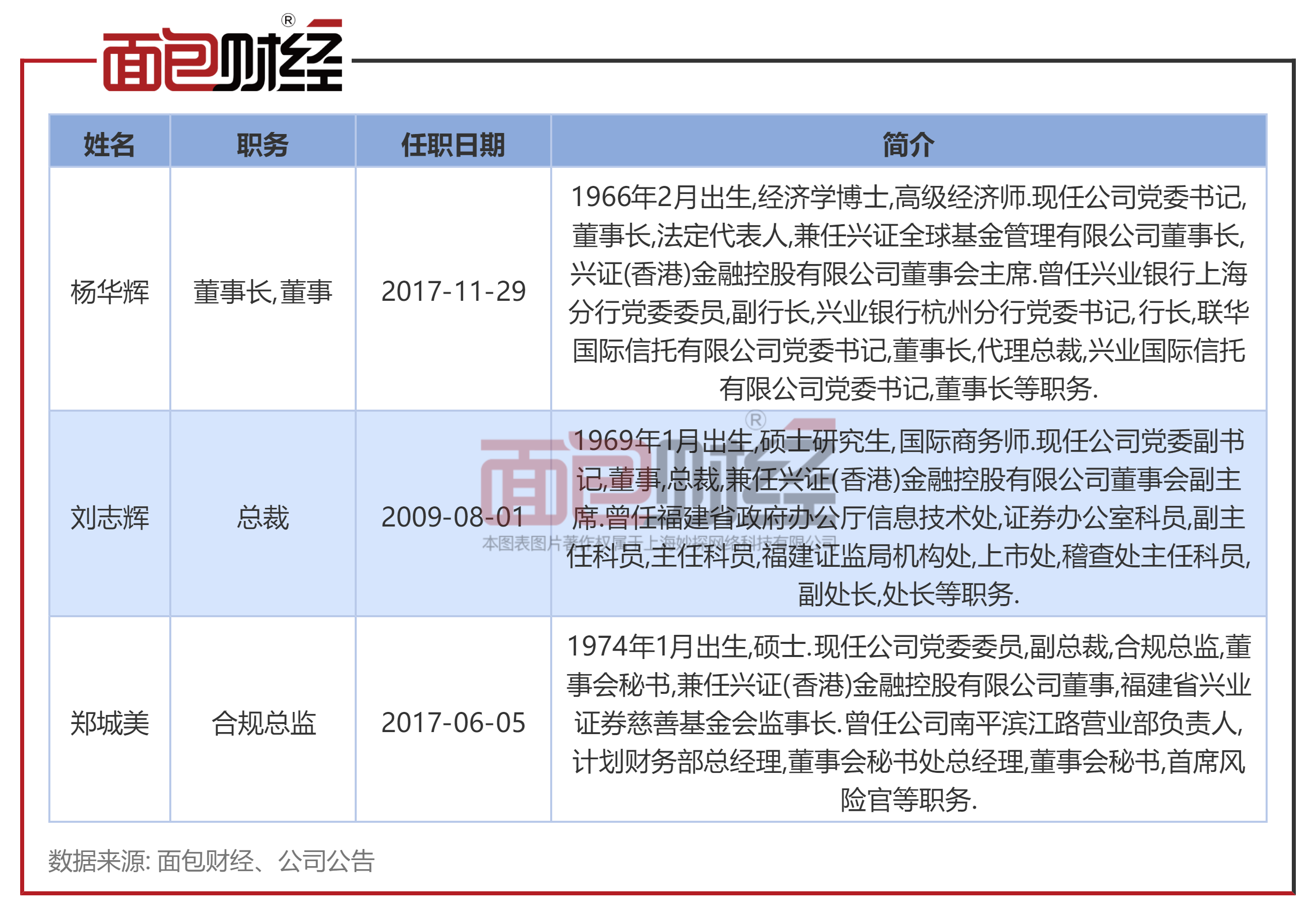 公开资料显示,杨华辉现任兴业证券董事长;刘志辉担任兴业证券总裁;郑城美担任兴业证券合规总监。