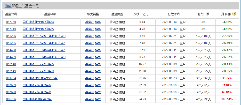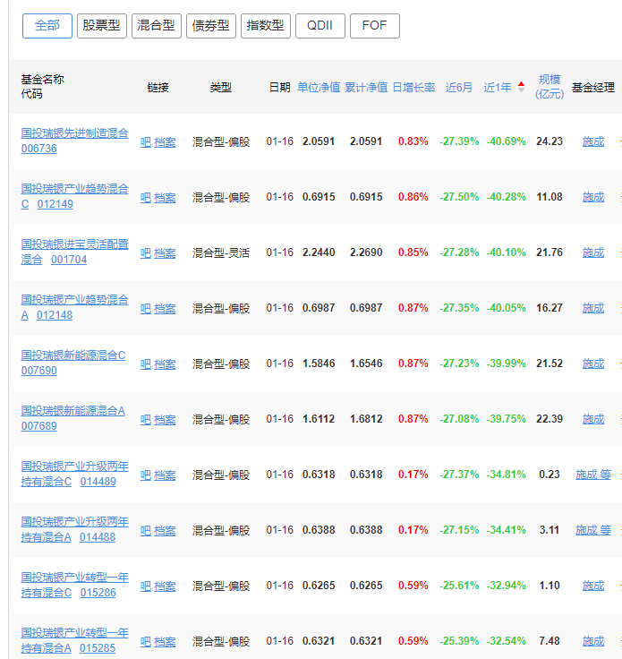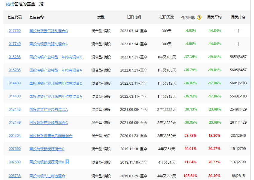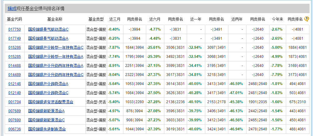 仔细观察,这些基金近1年投资收益都在-30%以上,其中有4只跌幅超40%。其中,国投瑞银先进制造混合跌幅最大,跌幅40.69%。值得注意的是,为施成创造最佳业绩回报的也是这只基金,真可谓成也萧何败萧何。