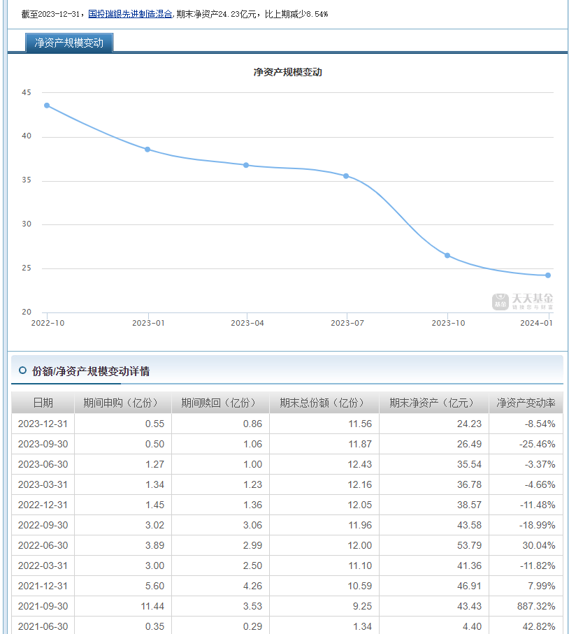 公司研究室注意到,国投瑞银先进制造混合的净资产规模,近年可谓坐了一回过山车,从2021年6月30日的4亿出头,飙升到2022年6月30日的53.79亿,之后开始下滑,2023年12月31日仅剩24.23亿,可谓腰斩。