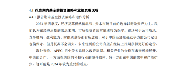 在国投瑞银产业转型一年持有混合A的四季报中,施成坦言:“2023 年四季度,经济复苏仍然偏温和,资本市场目前的选择以避险资产为主。我们认为在经济周期的衰退末期,市场投资者通常情绪较为保守。市场对于公司质地、竞争格局、盈利能力、财报质量等都有所忽视,对于中国经济里强竞争力的公司定价也偏保守。但是复苏不会消失,未来优质的公司有望在经济上行期获得更好的定价。”