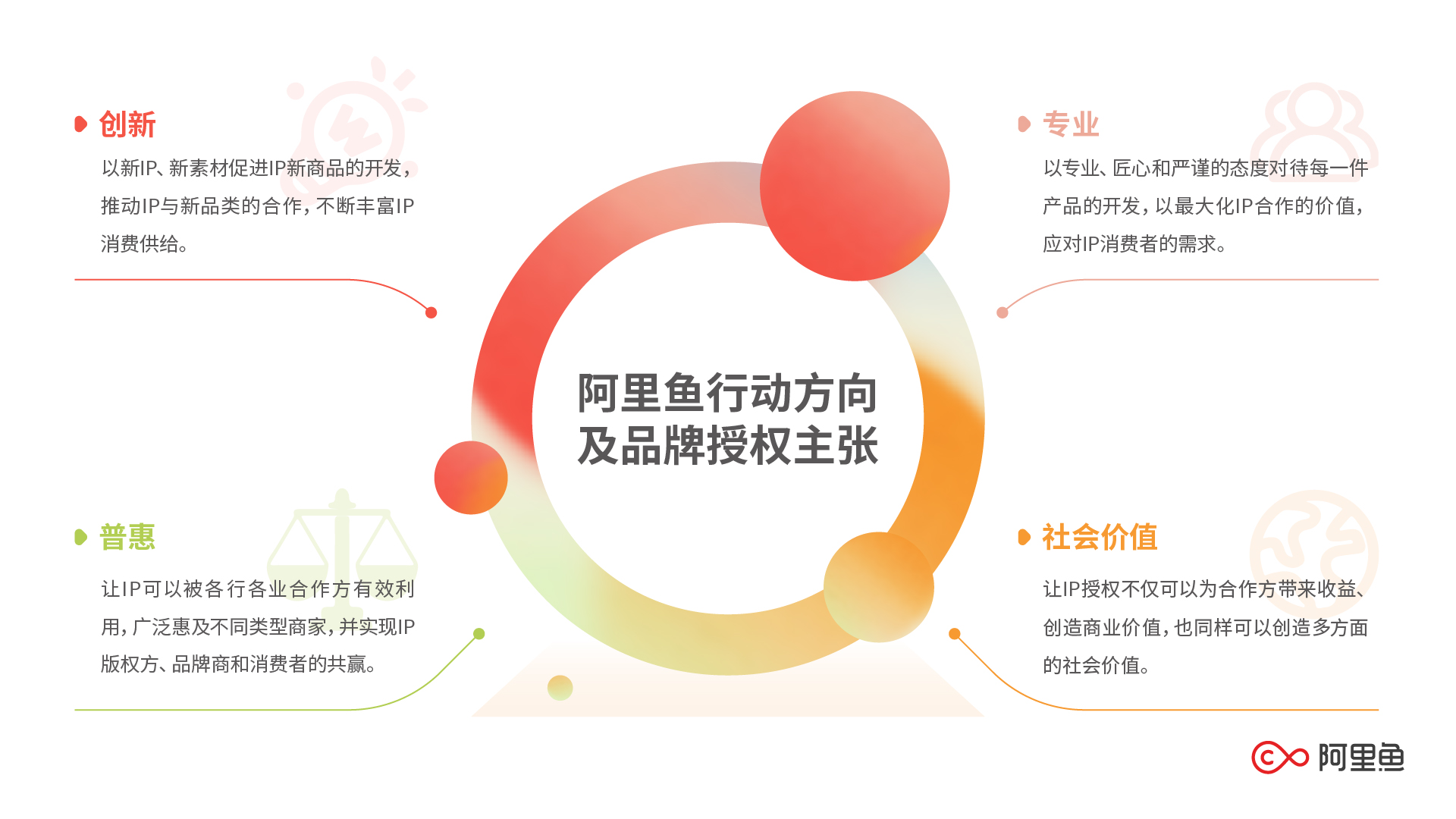 一方面,阿里鱼以精准的IP和消费者洞察为起点,在帮助版权方提升IP商业价值的同时,更为合作商家提供了从IP素材开发到设计监修报审、从渠道产品供给到整合营销支持的全链路专业服务,全面助力商家通过IP合作实现多元化增值目标;另一方面,除了直接的IP授权之外,阿里鱼还在IP内容开发与IP品牌运营、IP主题电商旗舰店运营、IP商品众筹与预售工具、IP商品多元销售渠道、IP自营商品开发、IP主题数字资产开发与发行等更多环节展开了探索。