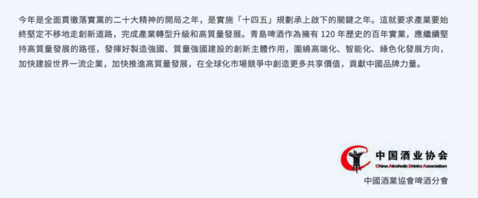 反观青啤报告的结尾,是一段来自中国酒业协会啤酒分会的评价,内容脱实向虚,场面话太多。