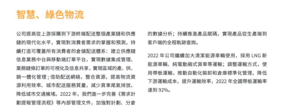 在青啤的ESG报告中,或许没有意识到这个问题的严重性,所以只用简短的内容介绍其在加大清洁能源车辆的使用,改善运输方式等。