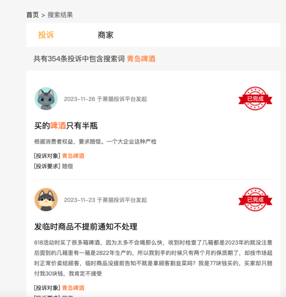 但在“小便门’事件出现之后,去黑猫投诉平台上一搜,仍然能发现不少网友针对青岛啤酒的投诉,包括酒内发现异物、销售过期啤酒、红包活动虚假、预设文字陷阱、恶意诱导消费,维权艰难的情况。