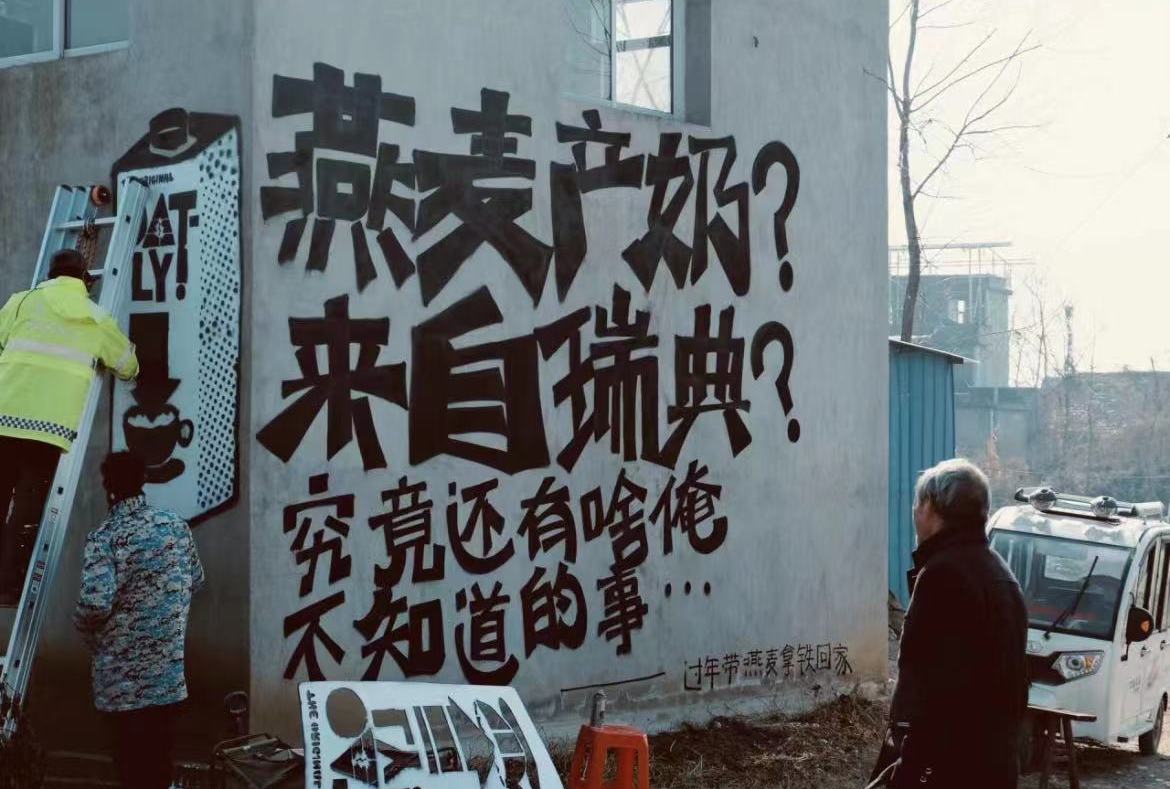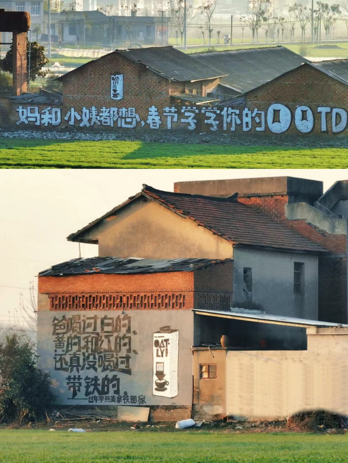 这也决定了墙面上的广告相比短视频、电视广告等形式,更容易给人留下深刻的印象。新潮的视觉效果与传统乡村场景形成对比,结合互联网语言,能在目标群体年轻人中具有更好的传播度,从而能起到起码让回家的人也记得OATLY这一品牌的作用。