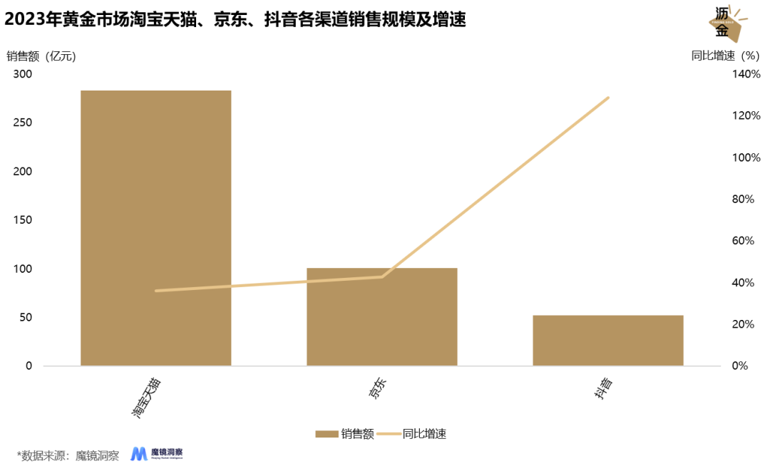 2023年黄金市场淘宝天猫、京东、抖音各渠道销售规模及增速