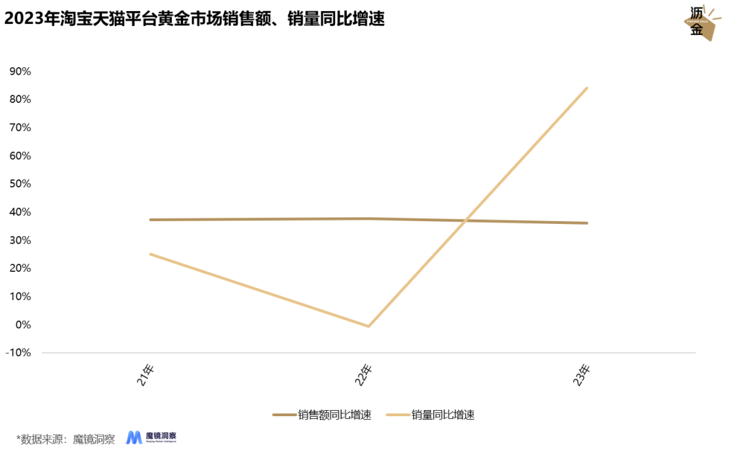 2023年淘宝天猫平台黄金市场销售额、销量同比增速
