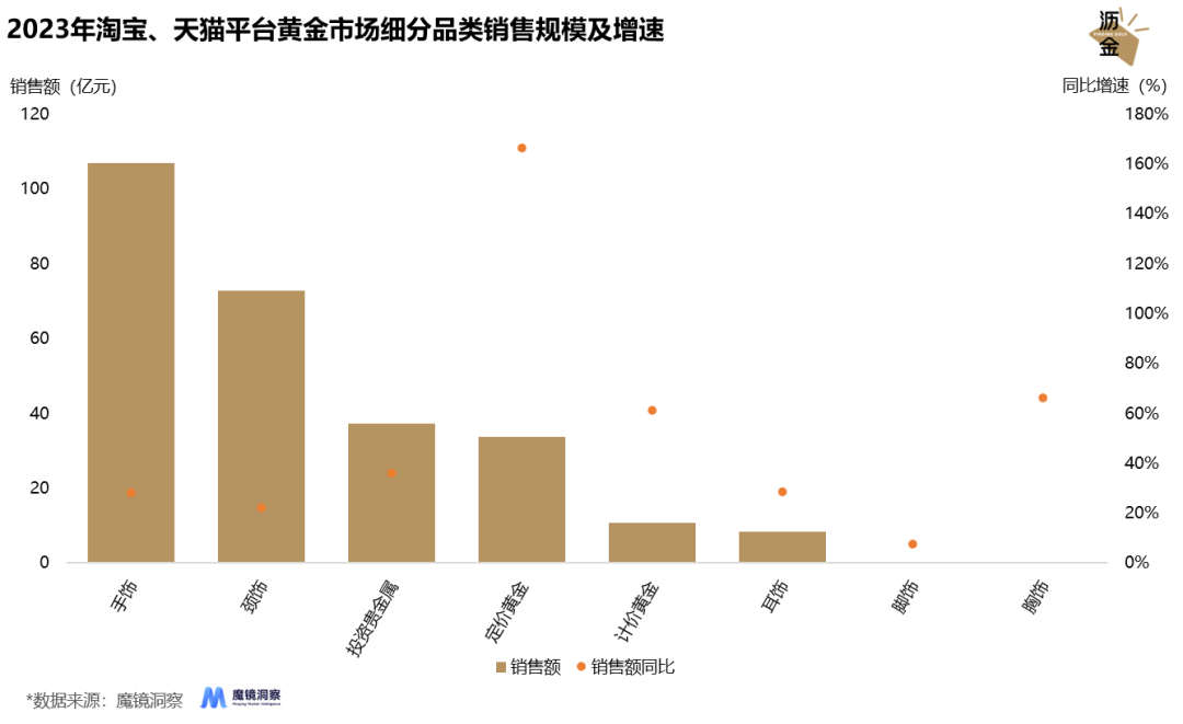 2023年淘宝、天猫平台黄金市场细分品类销售规模及增速