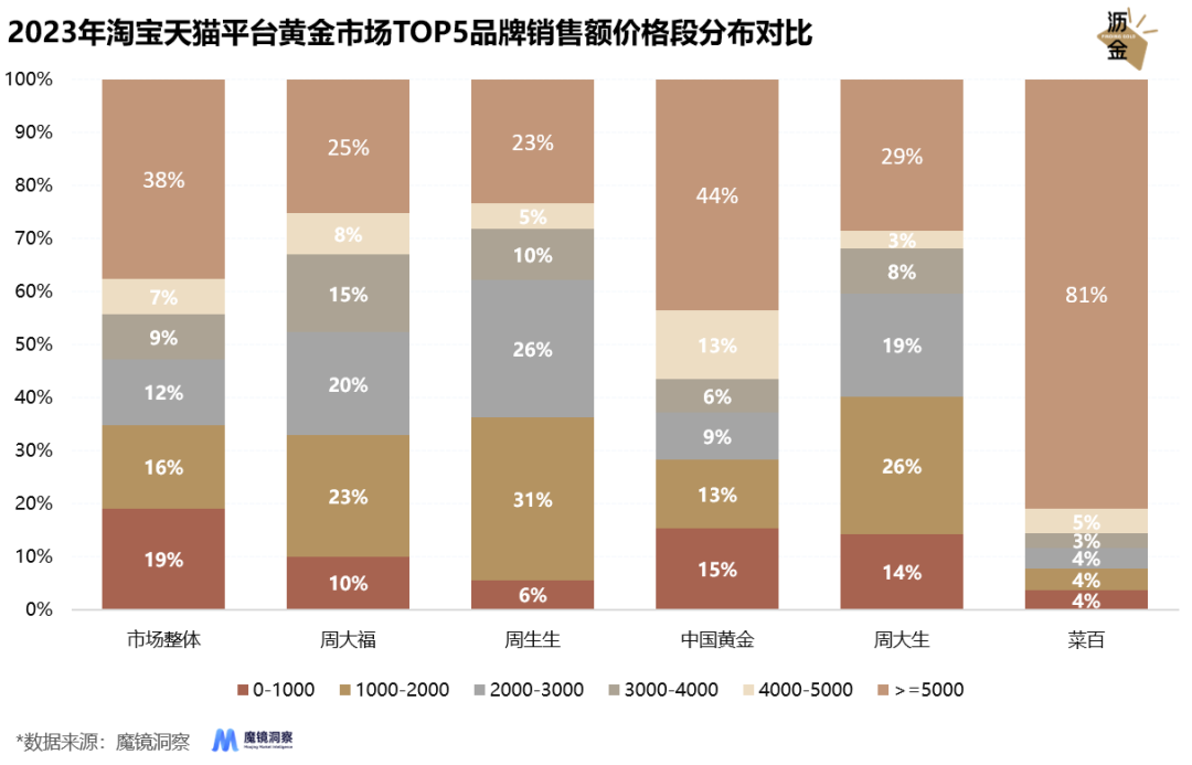2023年淘宝天猫平台黄金市场TOP5品牌销售额价格段分布对比