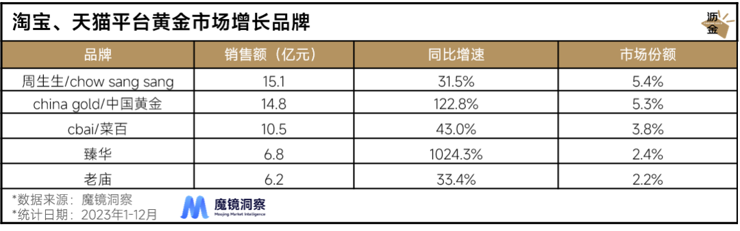 以30%的同比增速对黄金市场品牌进行筛选,周生生作为头部品牌,仍保持着31.5%的良好增速。中国黄金、臻华品牌增速亮眼,分别为122.8%、1024.3%。