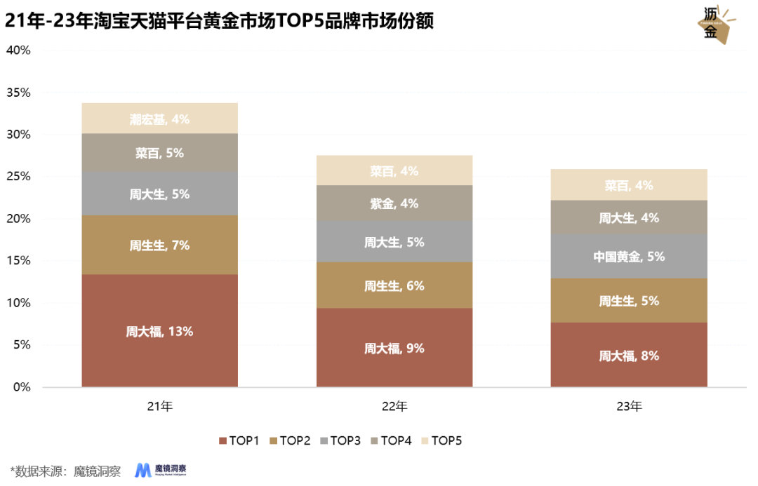 2021年-2023年淘宝天猫平台黄金市场TOP5品牌市场份额