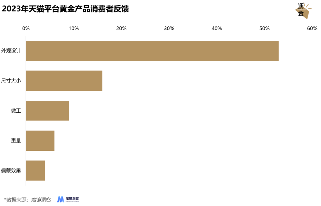 2023年,天猫消费者对黄金产品的评论总数在20万+,对消费者而言,外观设计是购买决策中最为重要的因素,占比高达53.0%。