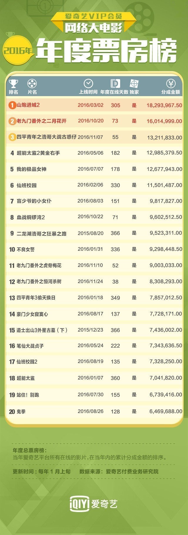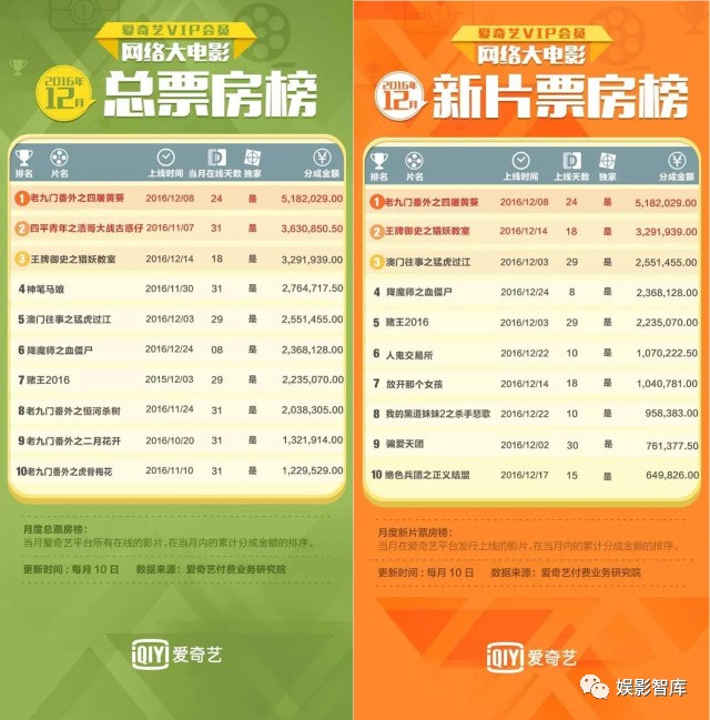 为了这一生态能够健康发展,真实的数据是必不可少的基础保证。所以,去年爱奇艺决定公开票房分账数额和排行,此举可以算是2016年网络电影行业的一个大新闻,引发了行业的震动(戳我回顾2016年网络电影十大事件!)。