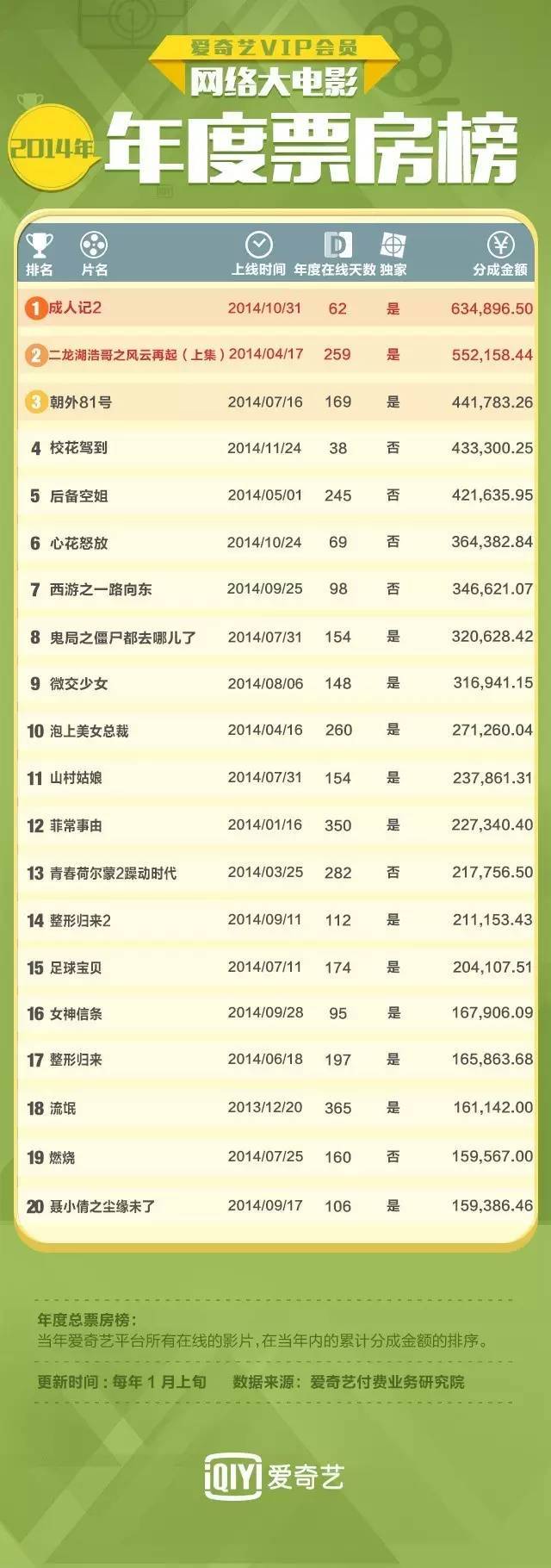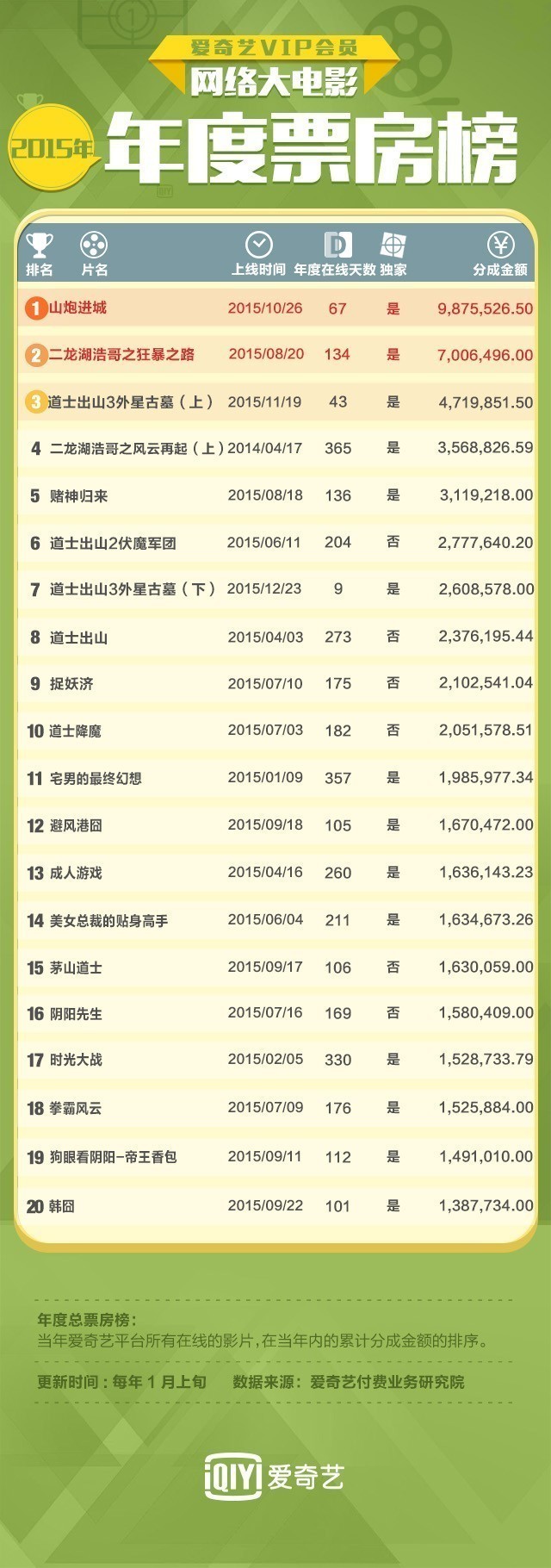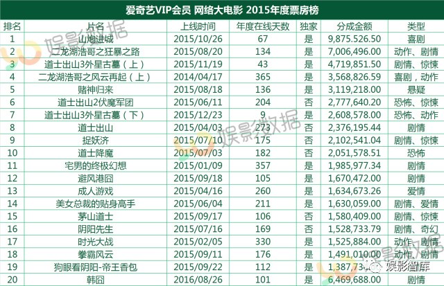 在娱影君看来,爱奇艺公开的年度票房不仅仅是一连串数字,而是市场的风向标。这些数字背后隐藏着哪些制作和赚钱的秘密?网络电影市场未来又将何去何从?且听娱影君为你一一分解!