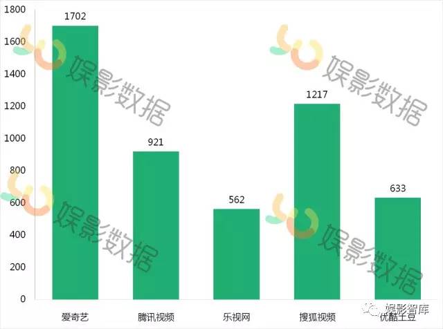 上图为2016年各平台上线影片的数量分布(包含非独播影片),在今年上线的2193部网络电影有1702部在爱奇艺上线,搜狐视频1217部,腾讯视频921部,优酷土豆633部,乐视约562部。我们可以发现,无论是独播影片还是非独播影片,爱奇艺都是片方的首要选择。