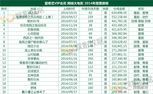 从2014年到2016年的年票房榜单来看,娱影君还发现,14、15年上榜的影片虽然以爱奇艺独播为主,但仍有五六部影片是非独播影片。但到了2016年,上榜的20部影片均为爱奇艺独播。这也说明了在网络电影市场摆脱野蛮生长的今天,视频平台的宣传资源越来越重要。