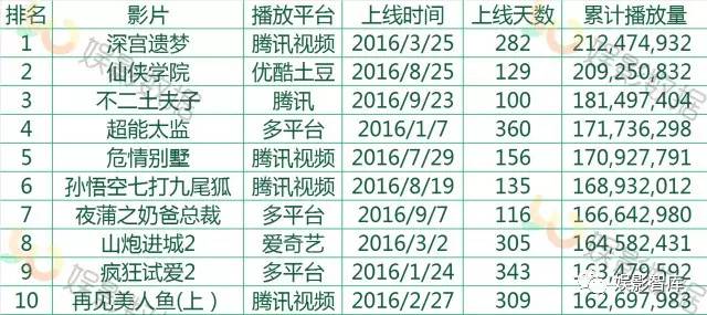 (2016年网络电影播放量TOP10)