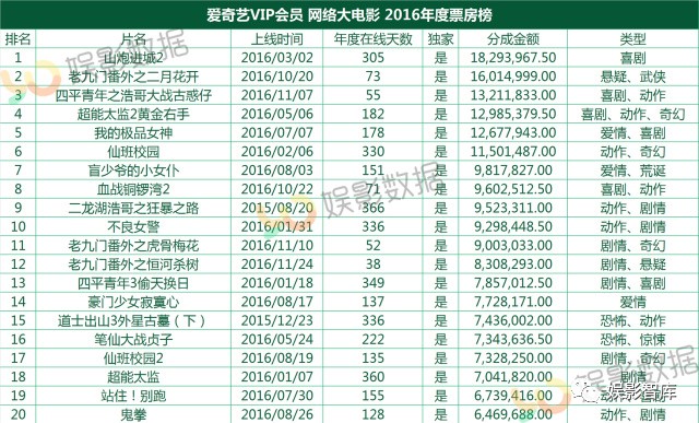 我们更可喜的发现,2016年有6部网络电影分账过千万,分账过500万的也从15年的2部翻了十倍——今年至少有20部影片超过了这一数字。