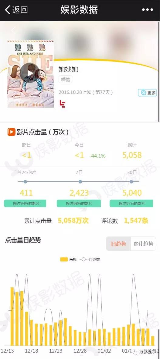 例如,今年10月28日在乐视独家上线的影片《她她她》锁定女性用户,讲述都市闺蜜情。首24小时播放量411万,首周播放量2423万,累计票房达到了5057万,并且斩获了第45周周榜的第一名。(戳我复习)当然,在高速发展的信息时代,要想从韩国欧巴的手中抢夺迷妹,对于网络电影无论是演员颜值还是制作水准的要求将会更高。