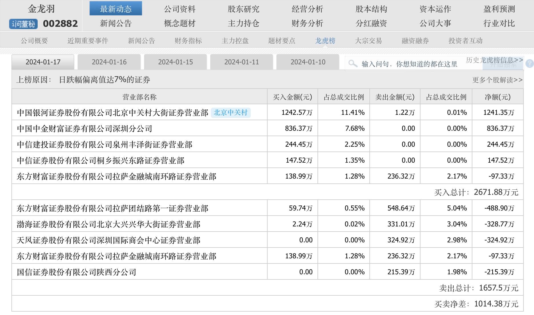 在此背景下,1月17日,上述银河证券北京中关村大街营业部选择硬刚,于开盘试图撬动“一字跌停”的金龙羽,无奈金龙羽当日的股价被“焊死”在跌停板位置,北京中关村大街营业部当日最终无功而返。盘后龙虎榜数据显示,北京中关村大街营业部当天撬板的资金为1242.57万元,位列买入前五之首。另外中国中金财富证券深圳分公司等也有跟随。算上1月16日的买入金额,这北京中关村大街营业部两天时间就闷进去3000万元的真金白银。
