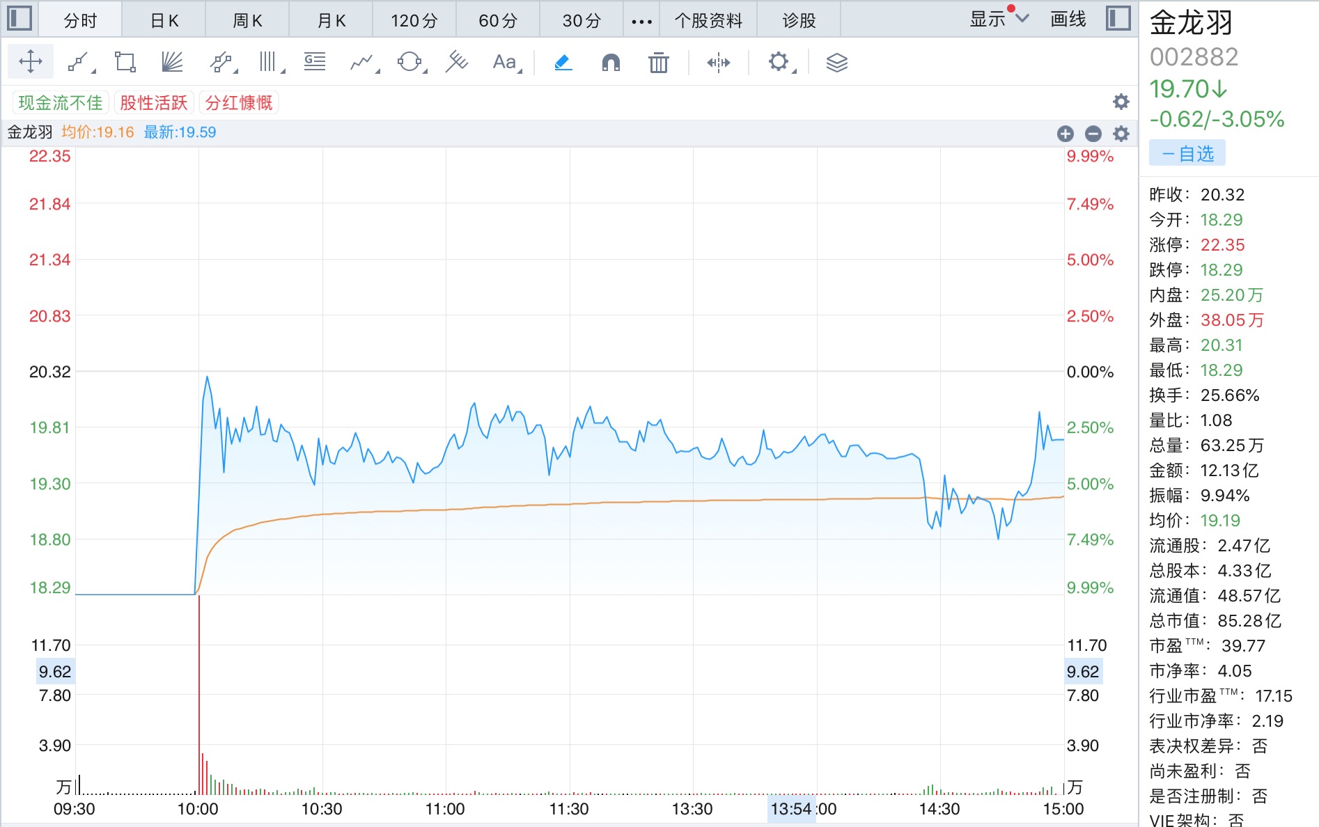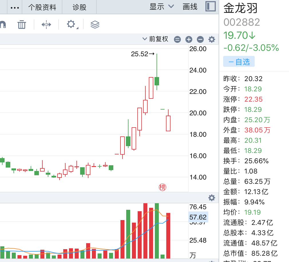 1月16日下午2点20分左右,有多头资金继续推高金龙羽,使股价一路上攻到9.49%。但分歧出现,收盘前半小时,空方力量明显强过多头,金龙羽最终在1月16日以3.05%的跌幅收工。