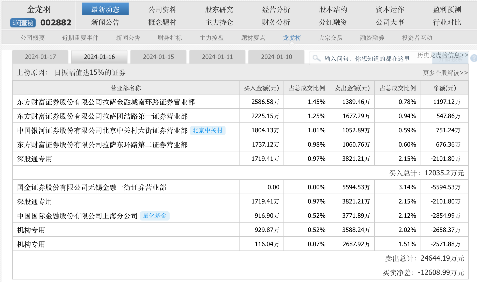 回顾1月16日龙虎榜,当日砸出筹码最多的是国金证券无锡金融一街营业部,卖出金额5594.53万元;深股通专用席位卖出3821.21万元;中金公司上海分公司卖出3771.89万元;两“机构专用席位”也有上榜。而买方阵容中,东方财富证券拉萨游资占了3席,合计买入金额6548.85万元,合计卖出4127.51万元,另外银河证券北京中关村大街营业部买了1804.13万元,卖出金额1052.89万元。1月16日买卖前五席位的净差为-12608.99万元。