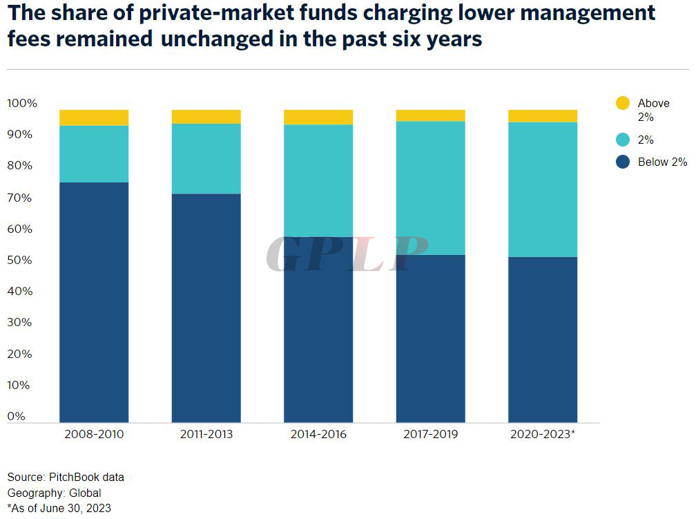 根据 PitchBook Data公布的数据,从2023 年上半年期间关闭的私募市场基金来看,约 50% 的管理费收费低于 2%,这一数据与前3年相比几乎没有变化。