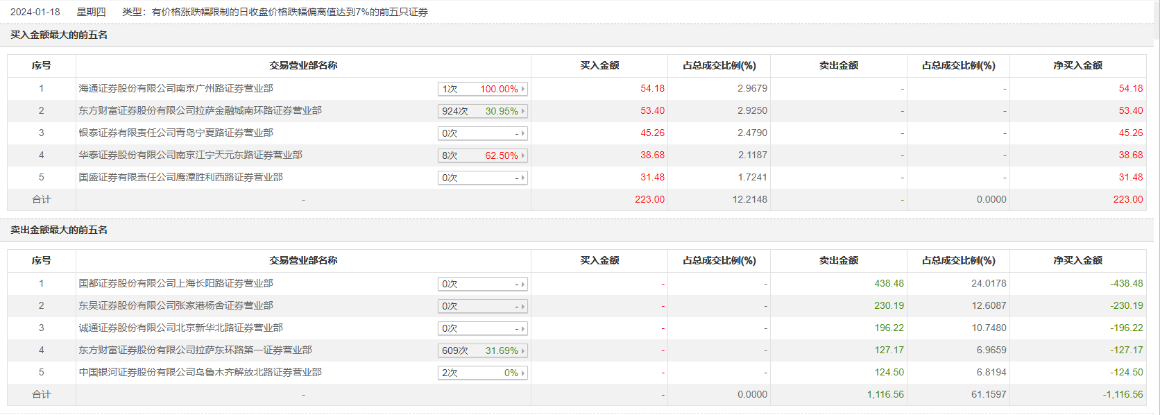 1月18日,宁夏建材今日跌停,全天换手率达0.24%,振幅达0%。龙虎榜数据显示,营业部席位合计净卖出893.56万元。其中,国都证券上海长阳路证券营业部、东吴证券张家港杨舍证券营业部分别卖出438.48万元、230.19万元;海通证券南京广州路证券营业部、东方财富证券拉萨金融城南环路证券营业部分别买入54.18万元、53.40万元。