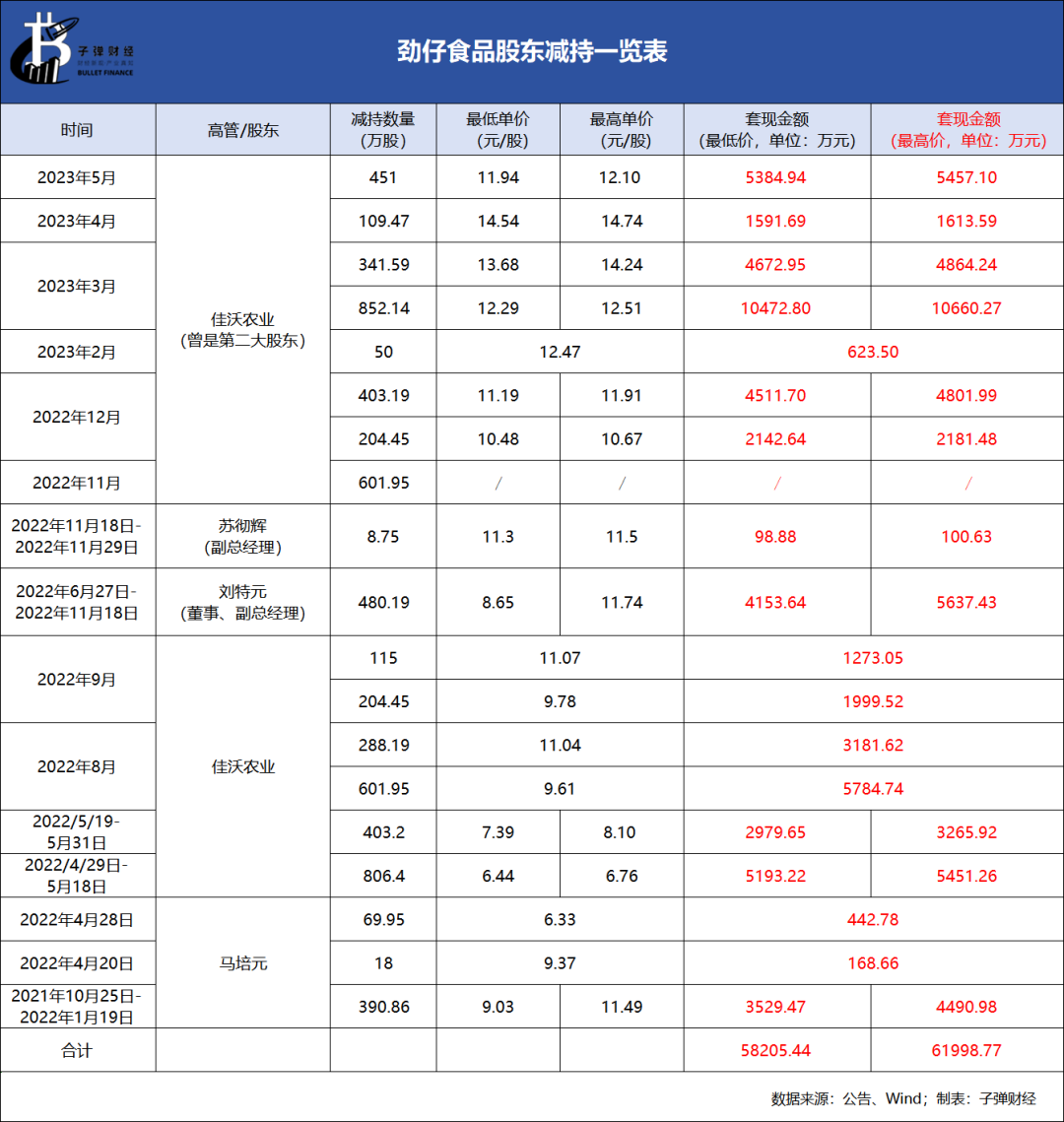 据子弹财经不完全统计,自2021年10月至2023年5月期间,前第二大股东佳沃农业、外部劲仔食品董事兼副总经理刘特元、劲仔食品副总经理苏彻辉及劲仔食品引入的第一个股东马培元纷纷减持。