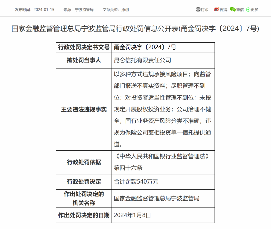 1月15日,国家金融监督管理总局官网显示,昆仑信托被宁波监管局处以540万元的罚款。