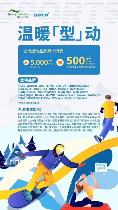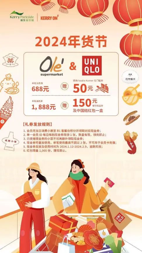 此外,浦东嘉里城新春年货节与温暖“型”动促销活动持续在线,多重礼遇好运来袭。1月12日至2月9日,凡是在Ole’或优衣库单笔消费满688元即可兑换“馔角Foodie Korner”50元无门槛赏味券;满1888元可以兑换150元赏味券,前1000位满额消费的“嘉”人还可以额外领取限量中国结红包一盒。同时,场内指定运动品牌累计消费满5000元可以兑换500元赏味券,更能乐享浦东嘉里大酒店带来的新年特惠礼遇。