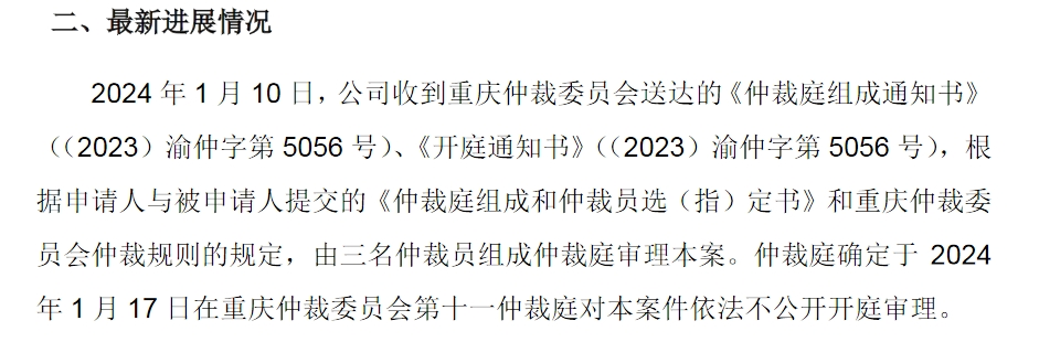 1月12日,新乳业发布公告称,1月10日收到了重庆仲裁委员会送达的《仲裁庭组成通知书》。