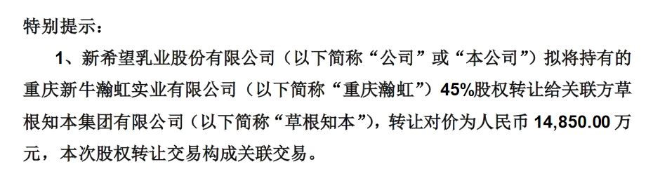 2023年11月29日,新乳业发布公告称,拟将持有的重庆瀚虹45%股权转让给关联方草根知本集团有限公司(下称“草根知本”),转让对价为14850万元。