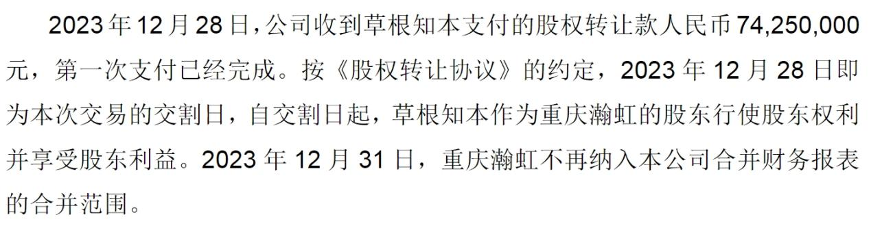 新乳业转移重庆瀚虹股权的事项非常迅速,2023年12月22日发布完成工商变更登记公告,几天后的12月29日就收到了第一次支付款。
