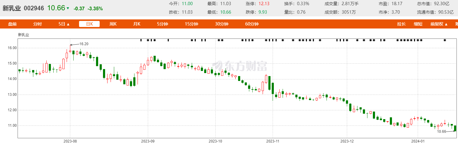 此外,新乳业的股价也比大盘走势弱很多,许多投资者“用脚投票”。统计显示,在不到一年的时间里,新乳业已从2023年2月的17.89元跌至今年1月18日收盘时的10.43元,跌幅超过了40%。
