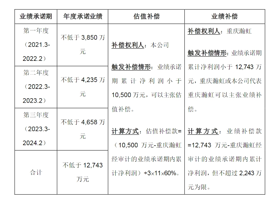重庆瀚虹的业绩目标为:第一年度、第二年度、第三年度的净利润分别不低于3850万元、4235万元、4658万元,累计净利润不低于12743万元。